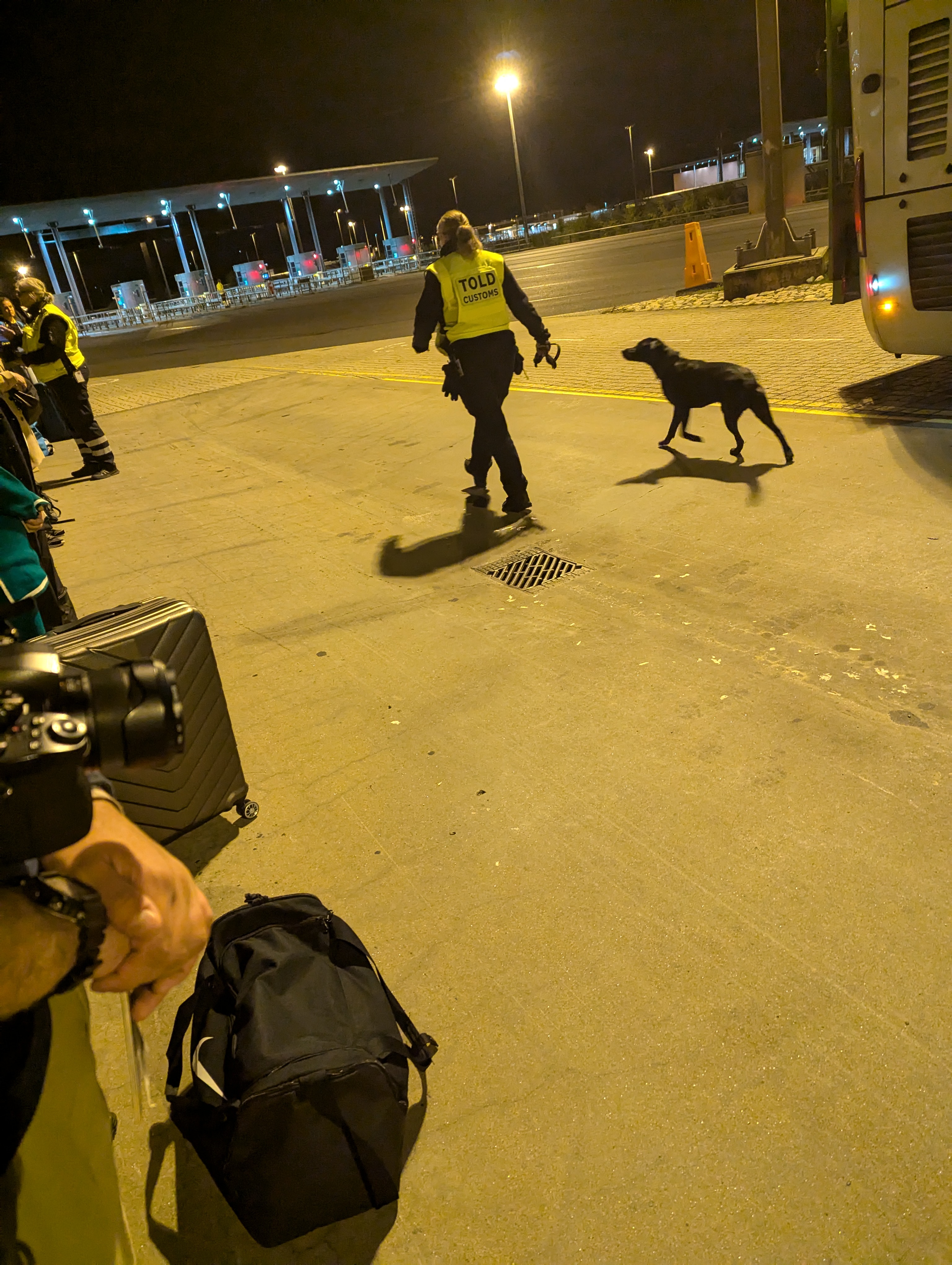 באה שוטרת בודקת את הדרכון שואלת מאין באתם ולאן תלכו ללון ולמה אתם עם מזוודות או למה אתם בלי מזוודות ואז בא כלב ומרחרח את התיקים ומתעכב על התיק שלי כמה שניות יותר מדי. לאט לאט אני שם לב שלא כתוב police אלא customes ושבכלל אין להם נשק. כשאמרו לכולם יאללה הכל בסדר תעלו לאוטובוס שאלנו את אחד מלובשי המדים מה העניין והוא אמר שזו פשוט בדיקה אקראית.
